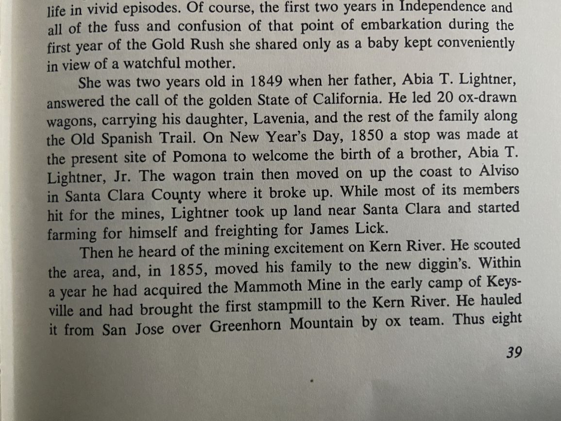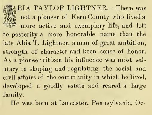 Part Of Abia Lightner's Obituary, Courtesy of "A Memorial and Biographical History of the Counties of Fresno, Tulare and Kern, California", Page 386, Published 1891
